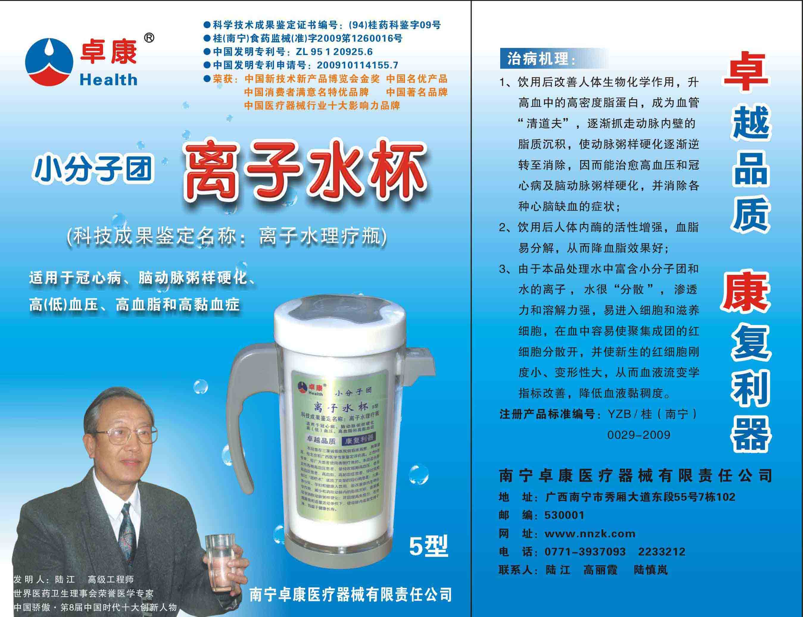 -----我是從事建筑的高工,本來沒有資格去攻克醫(yī)學(xué)難題,卻為了自身健康才扣響醫(yī)學(xué)的大門。由于我1990年患高血壓,因怕中風(fēng)才研究發(fā)明了離子水瓶,我把水處理成微小分子團(tuán)水,飲用后治愈了高血壓。便于1993年底送到三家省級(jí)醫(yī)院做臨床試用4個(gè)月。經(jīng)北京和廣西醫(yī)學(xué)專家鑒定:"降脂降壓效果好"," 能擴(kuò)大心腦動(dòng)脈流量,改善心腦電圖以及微循環(huán)","對(duì)治療心腦動(dòng)脈粥樣硬化、高血壓、高血脂有良好的醫(yī)療保健作用。""產(chǎn)品的技術(shù)性能和療效達(dá)到了同類產(chǎn)品的國(guó)內(nèi)領(lǐng)先水平,經(jīng)廣西醫(yī)學(xué)科學(xué)情報(bào)研究所檢索,未見國(guó)外有類似報(bào)道。"中國(guó)醫(yī)學(xué)科學(xué)院張正國(guó)教授從美國(guó)國(guó)立醫(yī)學(xué)圖書館數(shù)據(jù)庫(kù)存Medline檢索英俄文資料,均未見類似報(bào)告。2000年上市后,我為了對(duì)消費(fèi)者負(fù)責(zé)而繼續(xù)觀察研究,一直通過《信譽(yù)卡》和《質(zhì)量跟蹤調(diào)查書》向患者承諾療效,請(qǐng)用戶使用6個(gè)月后反饋效果。和脂壓患者飲用2至5個(gè)月內(nèi),消除癥狀,停服藥物,血壓正常;冠心病患者飲用3~5個(gè)月逐漸減輕至消除心絞痛、房顫等癥狀,不再服藥,飲用1年左右心電圖正常,經(jīng)冠脈造影掃描無明顯狹窄,表明冠心病痊愈。大量患者還反映許多衰弱器官被修復(fù),讓前列腺增生、慢性咽喉炎、慢性氣管炎、支氣管炎、慢性胃炎、腸炎和膽囊炎等不藥而愈;2型糖尿病患者是因?yàn)橐葝u衰弱致病,飲用該水半年至一年,逐漸減藥至停藥,血糖尿糖正常,真正治愈2型糖尿病。中風(fēng)后遺癥患者飲用六七個(gè)月,可逐漸減輕至消除肢體和語言障礙,表明飲用該水能讓壽命很長(zhǎng)的神經(jīng)元細(xì)胞逐漸修復(fù),奇跡般地恢復(fù)肢體和語言功能。飲用后還使胸腺和脾臟兩個(gè)重要的免疫器官被修復(fù)和增強(qiáng),產(chǎn)生免疫細(xì)胞多,提高了免疫力,使人不生病或少生病。自此, 飲用微小分子團(tuán)水創(chuàng)造了攻克冠心病、高(低)血壓和糖尿病三大醫(yī)學(xué)難題的奇跡。人們對(duì)此感到不可思議,但實(shí)踐是檢驗(yàn)真理的唯一標(biāo)準(zhǔn)。